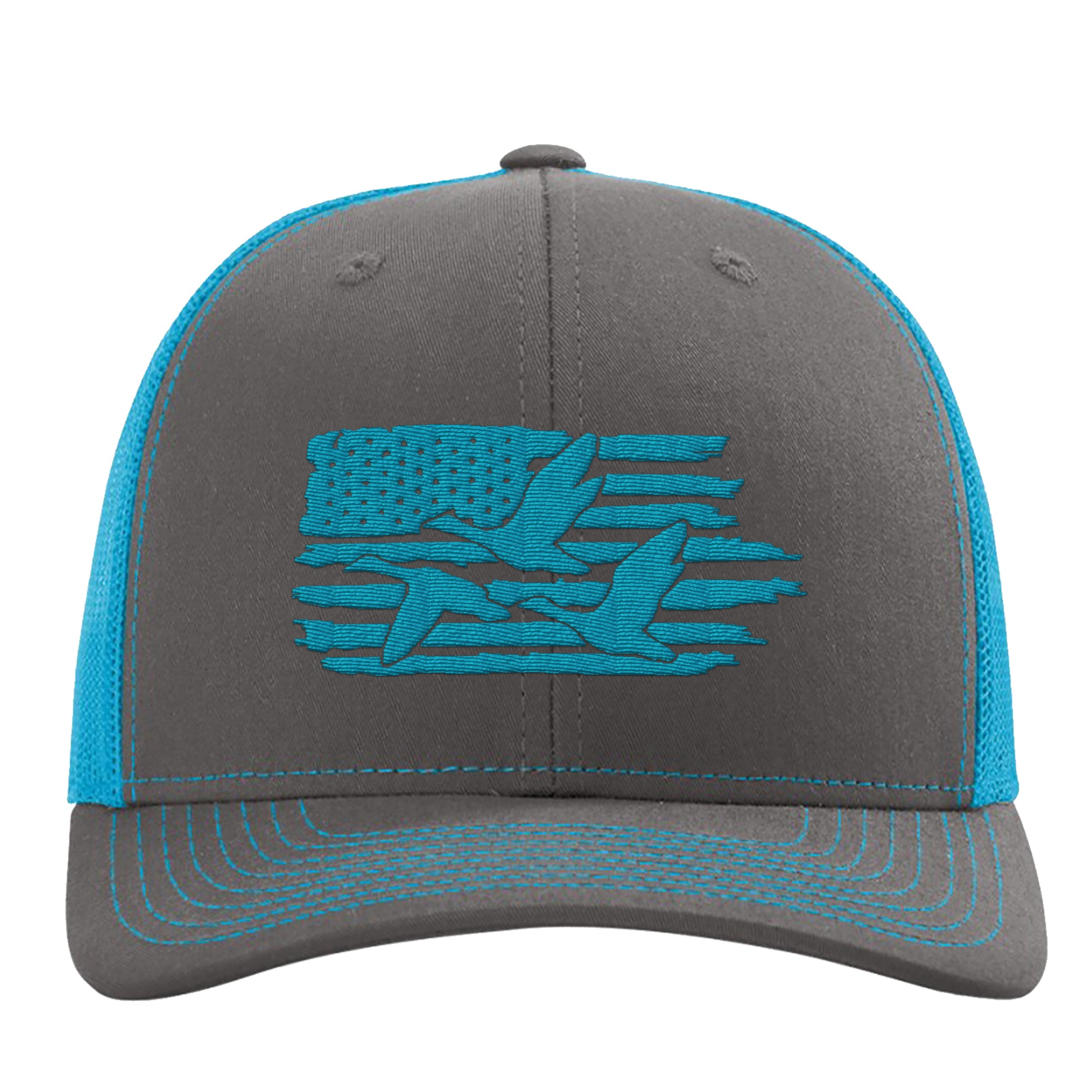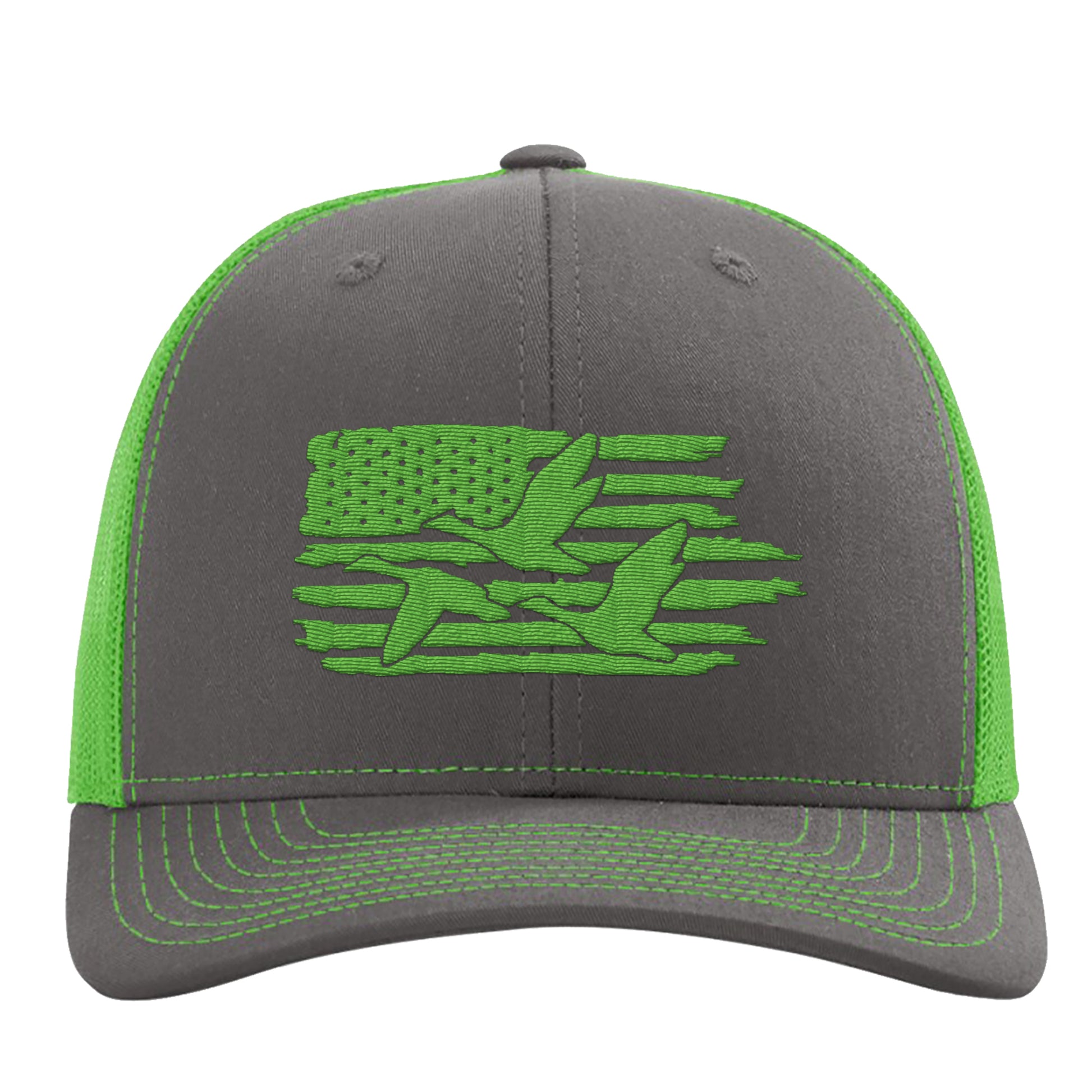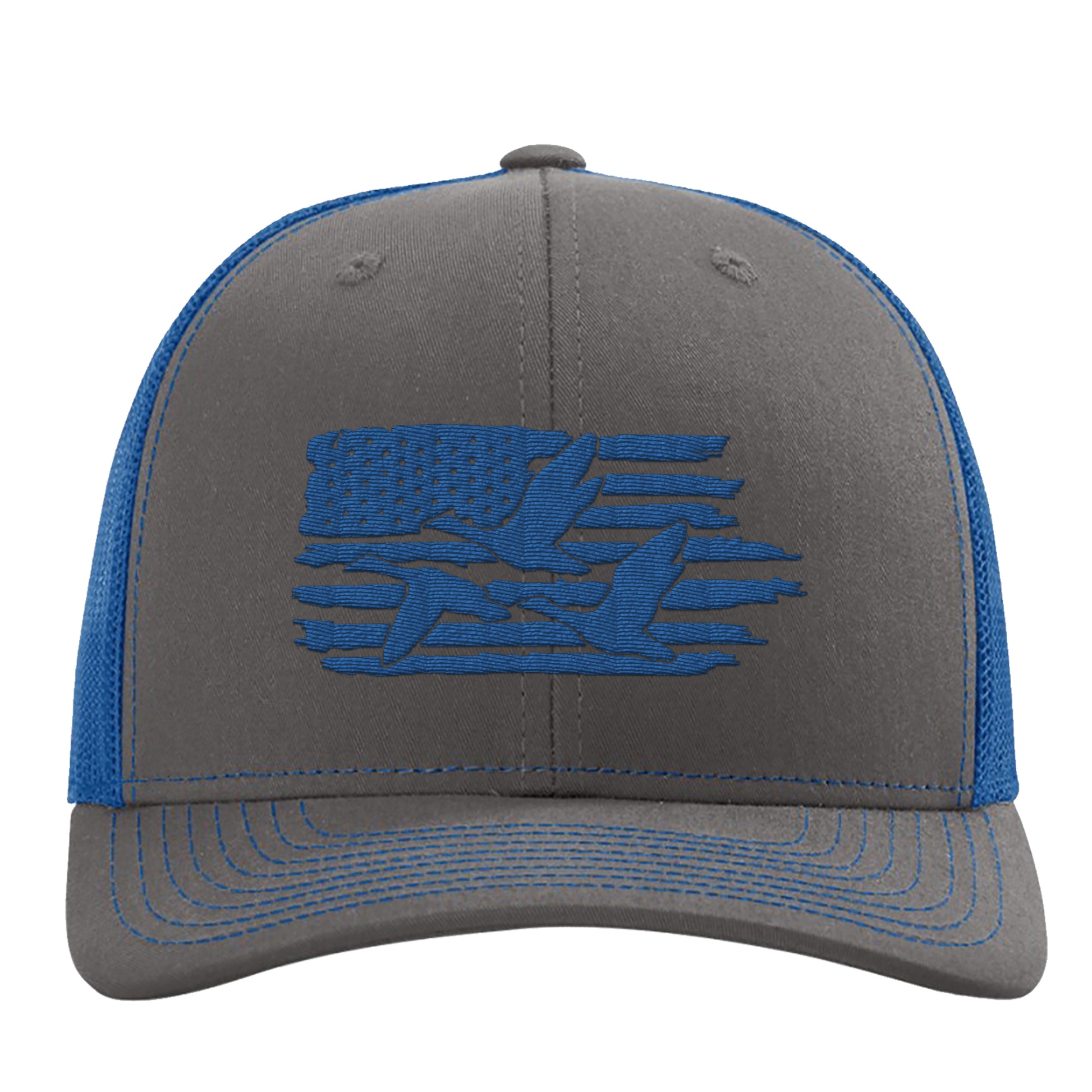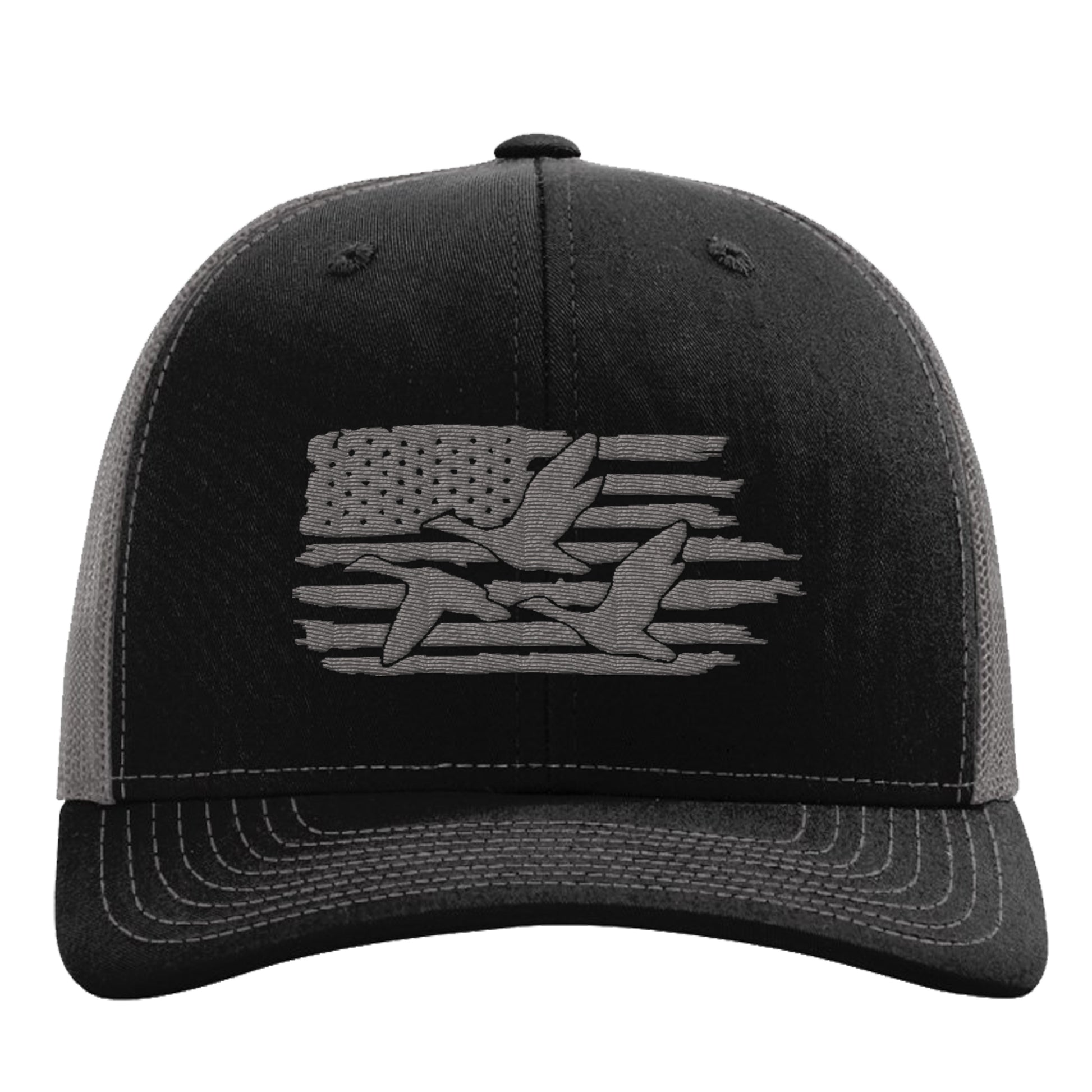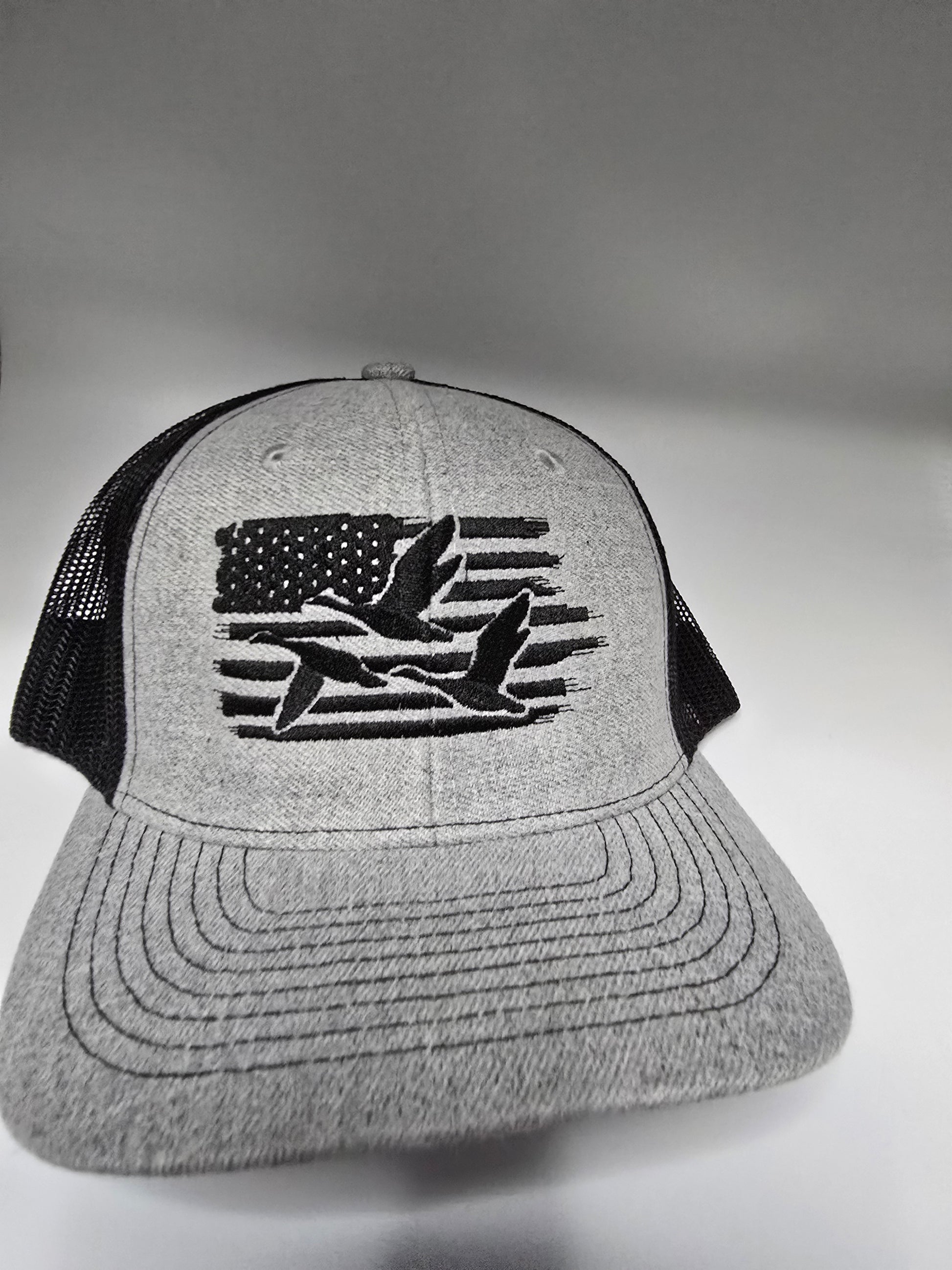 Show your passion for duck hunting and American pride with this premium embroidered cap! Featuring three ducks in flight against an American flag background, all rendered in beautiful single-color embroidery stitching.